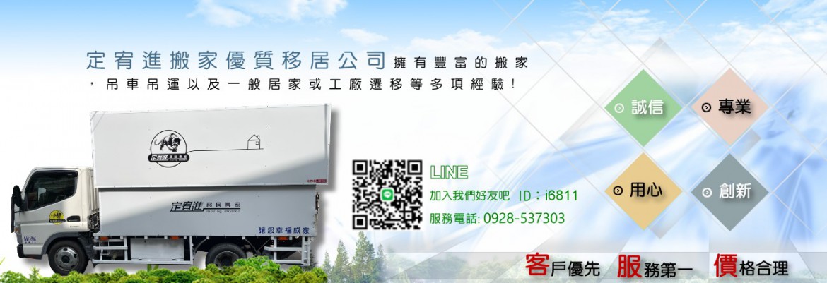 台南定宥進搬家優質移居公司成立至今已20年.致力推廣創新,提供客戶更完善的服務品質,擁有豐富的吊車吊運以及一般居家或工廠遷移等多項經驗!